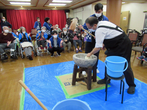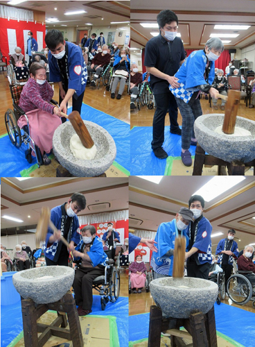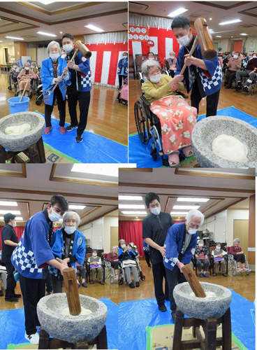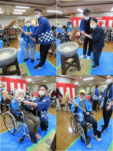 10月から入職しているネパール出身の男性介護士も初めての餅つきで興味津々でした
