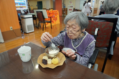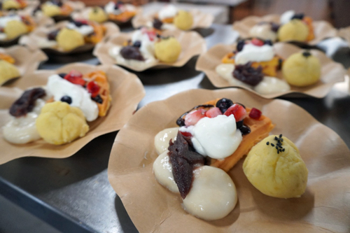 ワッフル、豆腐白玉団子に芋ようかん風巾着でした